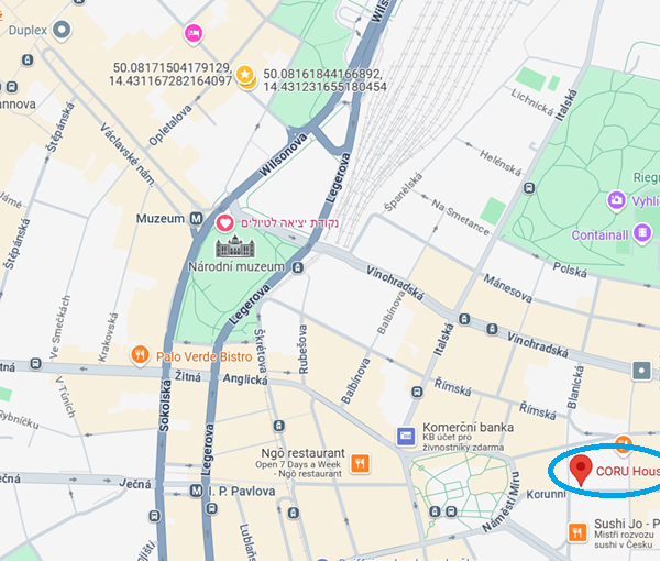 הבניין ממוקם בלב שכונה נעימה, שכונת וינוהראדי הפופולרית, צמוד לכיכר מירו – Náměstí Míru ו-10 דקות הליכה מהמוזיאון הלאומי וכיכר ווצלאב.